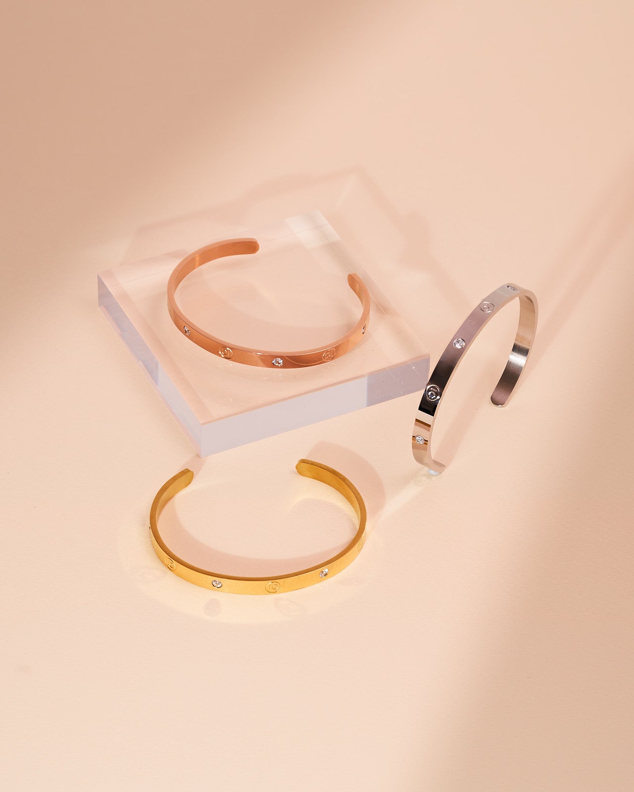 Our infinite Imanah Collection engraved cuff is built to last. Crafted of high quality durable stainless steel, this stackable cuff has our signature IC engraved, with sparkly cubic zirconia stones set in.